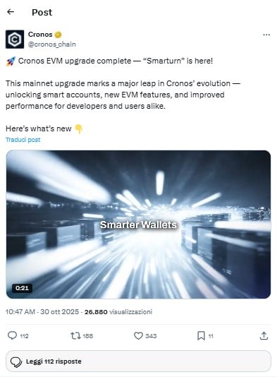 Ieri la blockchain di Cronos ha ultimato l’aggiornamento “Smarturn”, che ha introdotto modifiche alla compatibilità con la sua Ethereum Virtual Machine (EVM) e alle operazioni di rete complessive.